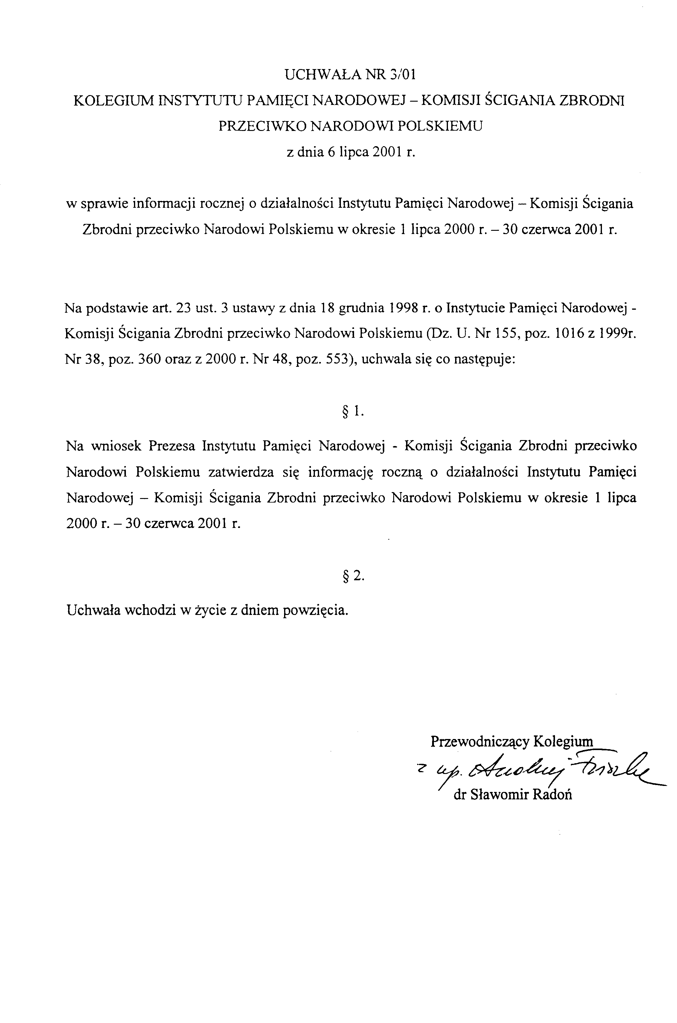 stosownie do art. 24 Ustawy o Instytucie Pamięci Narodowej - Komisji Ścigania Zbrodni przeciwko Narodowi Polskiemu w załączeniu przekazuję Informację o działalności Instytutu w okresie od 1 lipca 2000 r. do 30 czerwca 2001
