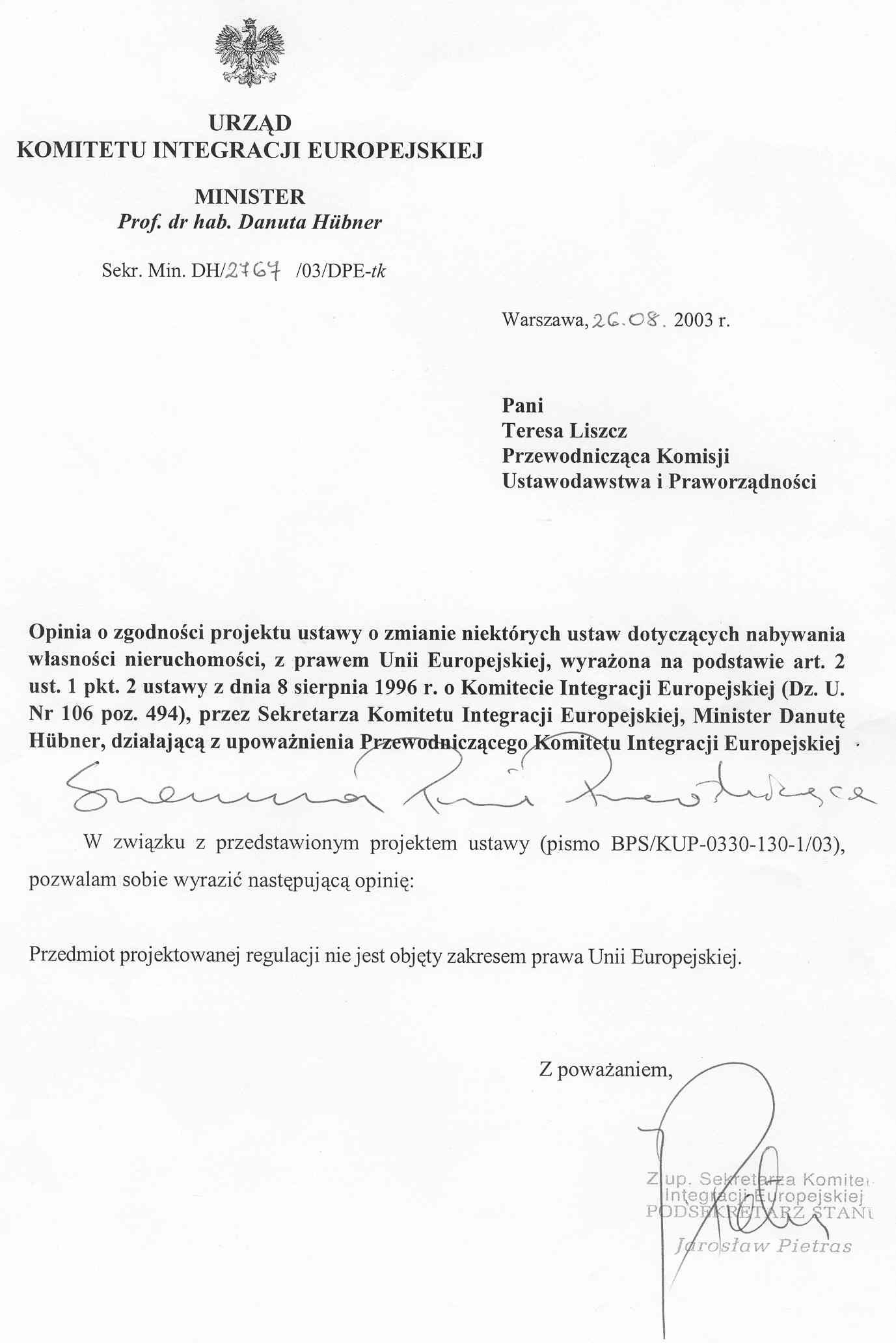 projektu ustawy wprowadziły poprawki do przedstawionego przez wnioskodawców projektu ustawy i wnoszą o przyjęcie przez Senat jednolitego, załączonego projektu ustawy o zmianie niektórych ustaw dotyczących nabywania własności nieruchomości, wraz z projektem uchwały w sprawie wniesienia do Sejmu tego projektu ustawy.W załączeniu przedstawiamy także informację o zgodności projektu ustawy z prawem Unii Europejskiej.