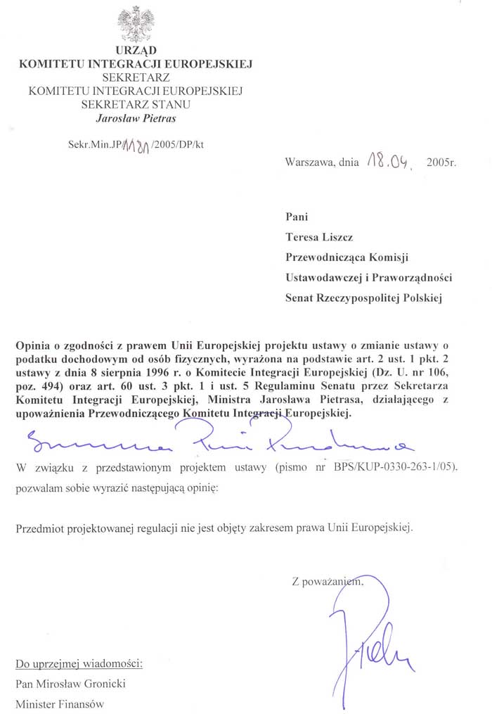W załączeniu przedstawiamy także informację o zgodności projektu ustawy z prawem Unii Europejskiej.