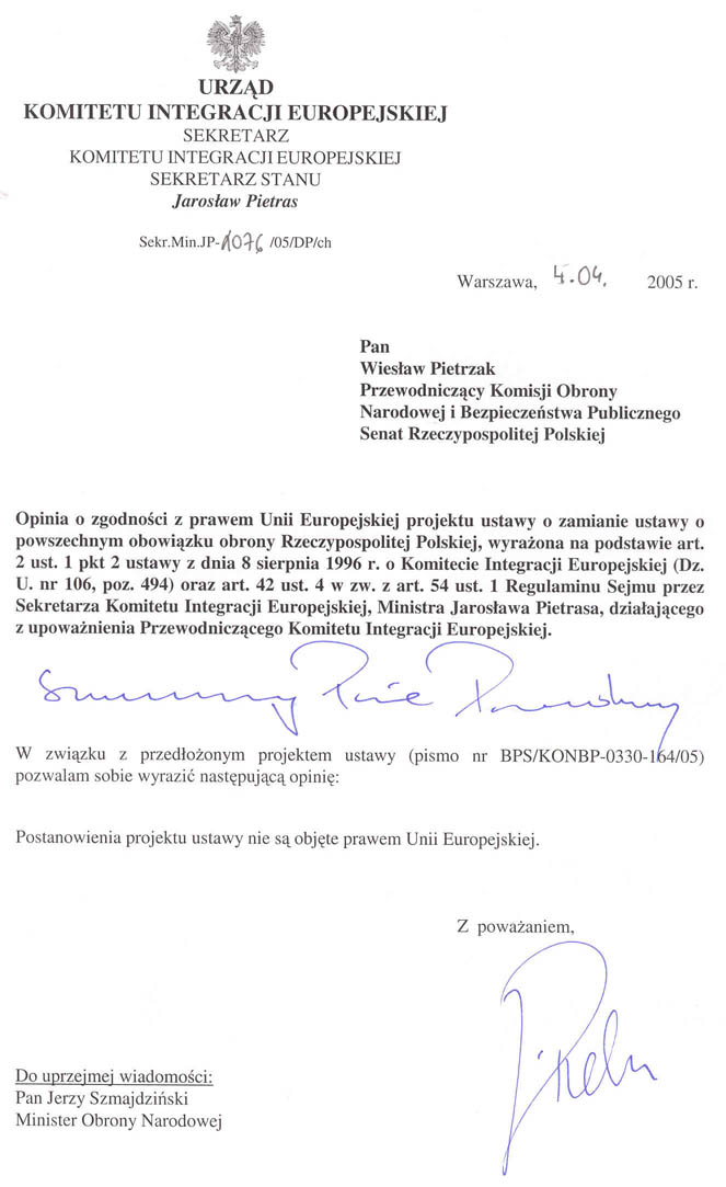 Na podstawie art. 77 ust. 1, w związku z art. 76 ust. 1 Regulaminu Senatu Komisja Obrony Narodowej i Bezpieczeństwa Publicznego wnosi o podjęcie inicjatywy ustawodawczej dotyczącej projektu ustawy o zmianie ustawy o powszechnym obowiązku obrony Rzeczypospolitej Polskiej