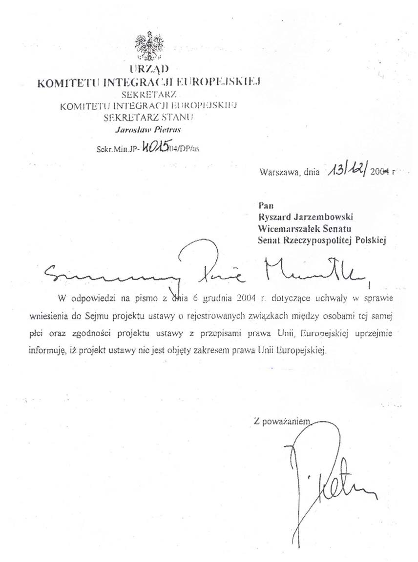 Związek osób tej samej płci nie jest małżeństwem, ponieważ małżeństwo, zgodnie z art. 18 Konstytucji to związek kobiety i mężczyzny i jako taki podlega ochronie, a więc nie można w sposób bezpośredni odwołać się do przepisów prawa regulujących związek małżeński. Ochronie konstytucyjnej podlega także rodzina. Związek osób tej samej płci nie jest też